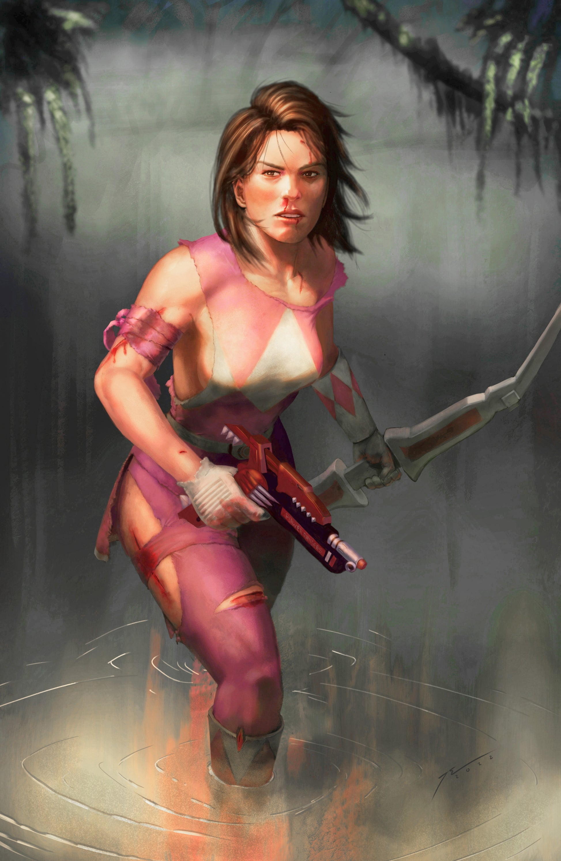 🔥 Anger fuels her every step as Kimberly Hart, the Pink Mighty Morphin Power Ranger, wades through the murky depths of a swamp, her suit torn and her body scarred. With her blade blaster in one hand and her power bow in the other, she’s ready for whatever comes next, even as she uses the remnants of her suit to wrap her worst injuries. Bloodied but unbroken, Kimberly's fierce expression tells the world that she’s far from done. Her determination burns in the swamp’s damp air, a warrior who’s been through hell and is still standing. The anger in her eyes reflects her survival, proving that no matter how harsh the battle, Kimberly Hart is a force that cannot be defeated.