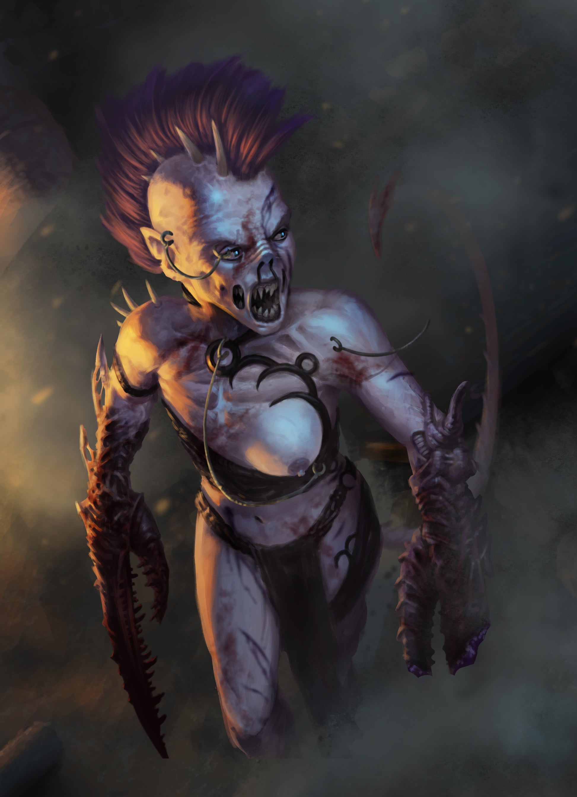 - Design: A powerful portrayal of the Daemonette, prowling through the smoky ruins of a battlefield. Her body, marked by the scars of war, is an object of twisted beauty. Her monstrous features are balanced by the allure of a predator who thrives in the devastation, thirsty for blood and yet drawing you in with every movement.