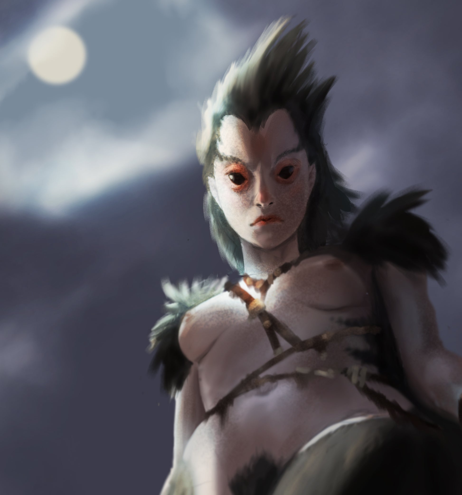 - Design: A mesmerizing, chilling portrayal of the Harpy standing over her prey. The moonlight casts a silver glow on her body, highlighting her curves, while her face—a haunting mix of human and bird—adds a layer of unsettling beauty.